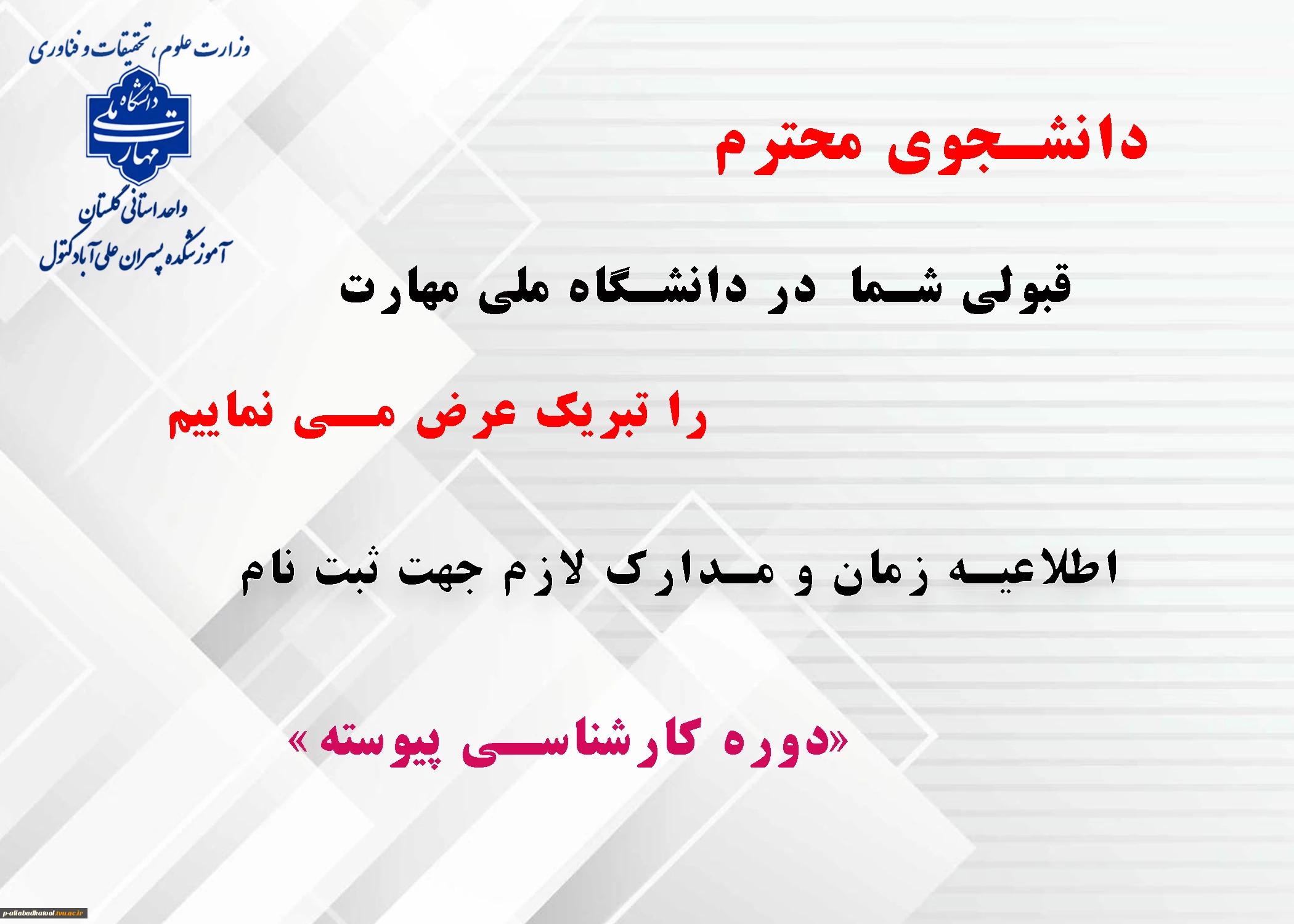 امتیاز دهید : زمان ثبت نام و مدارک ثبت نام دانشجویان نو ورود 1404 - کارشناسی پیوسته مهندسی حرفه ای معماری و کارشناسی پیوسته مهندسی حرفه ای کامپیوتر 3 یکشنبه 20 مهر 1404 ساعت 14:15